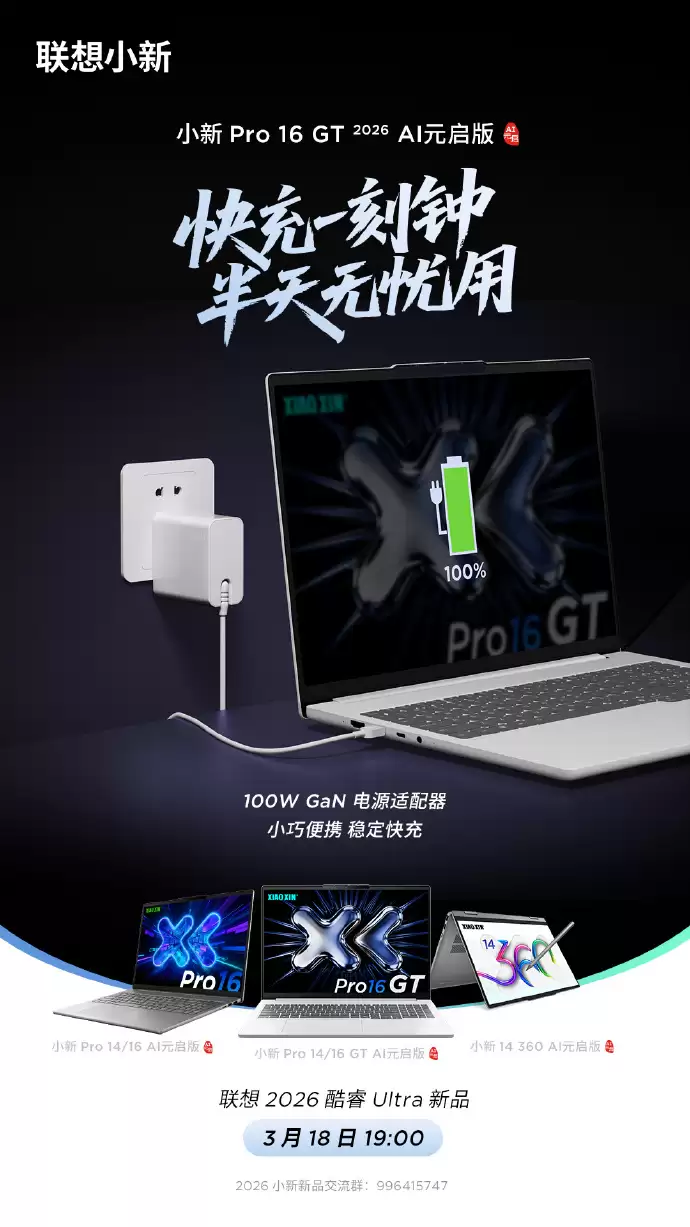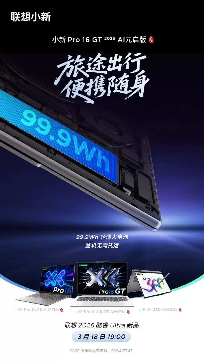 联想官方已确定,小新Pro 16 GT AI元启版将于2026年3月18日晚7点正式发布。这款笔记本的核心配置极具针对性:英特尔第三代酷睿Ultra处理器平台、接近民航上限的99.9Wh超大电池、核显性能大幅提升77%,并深度整合了本地AI算力,旨在建立新的产品标杆。