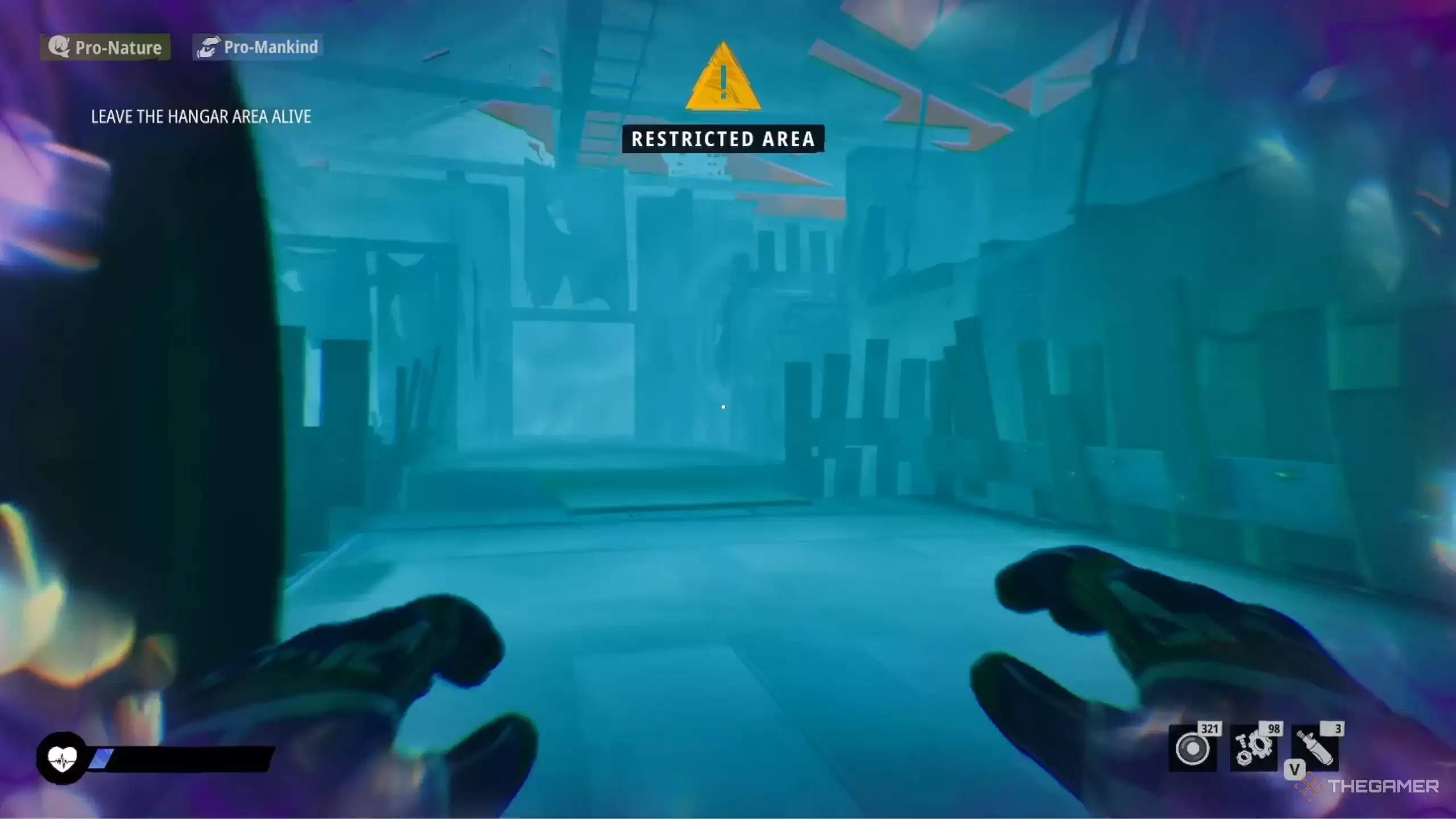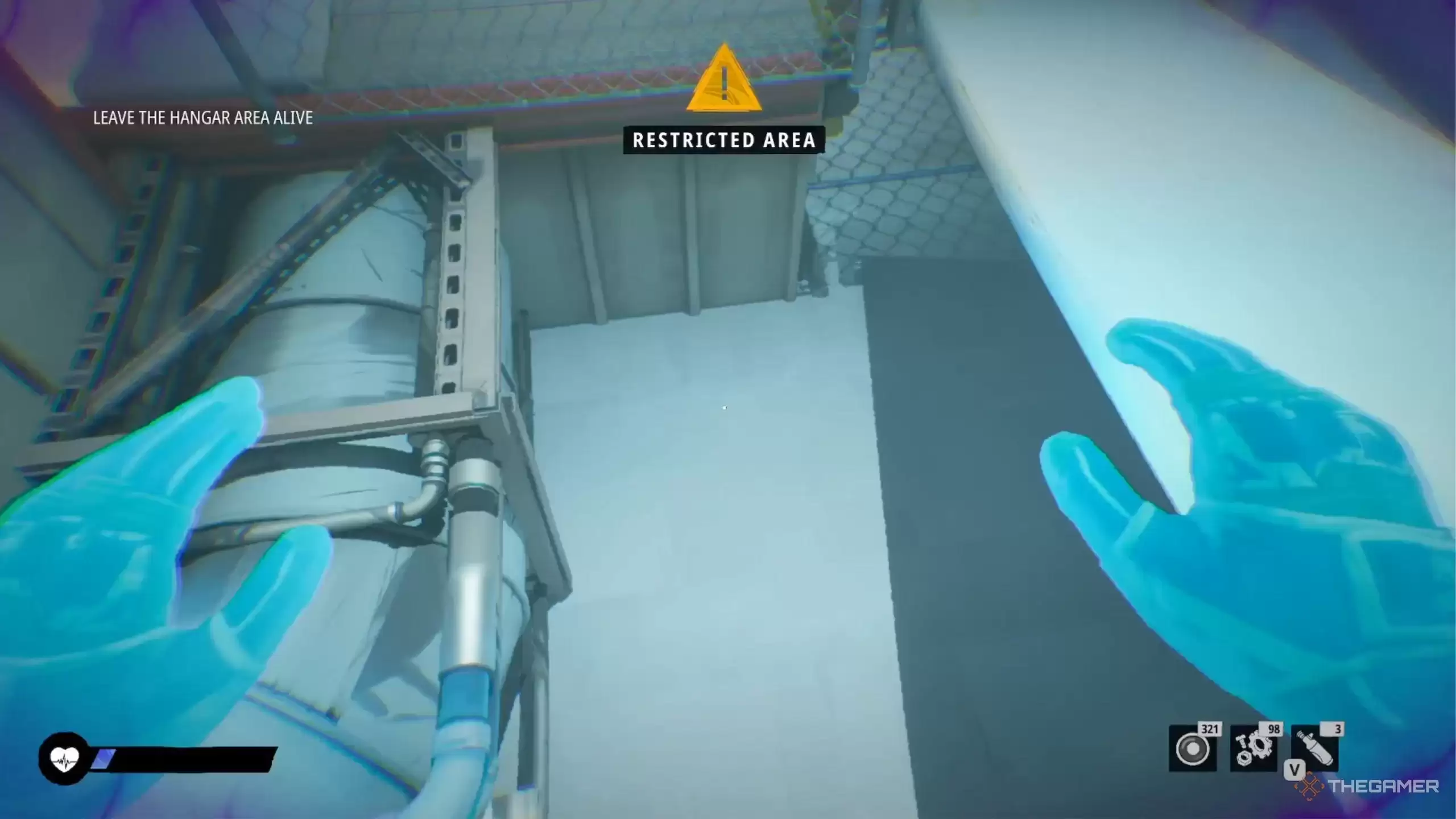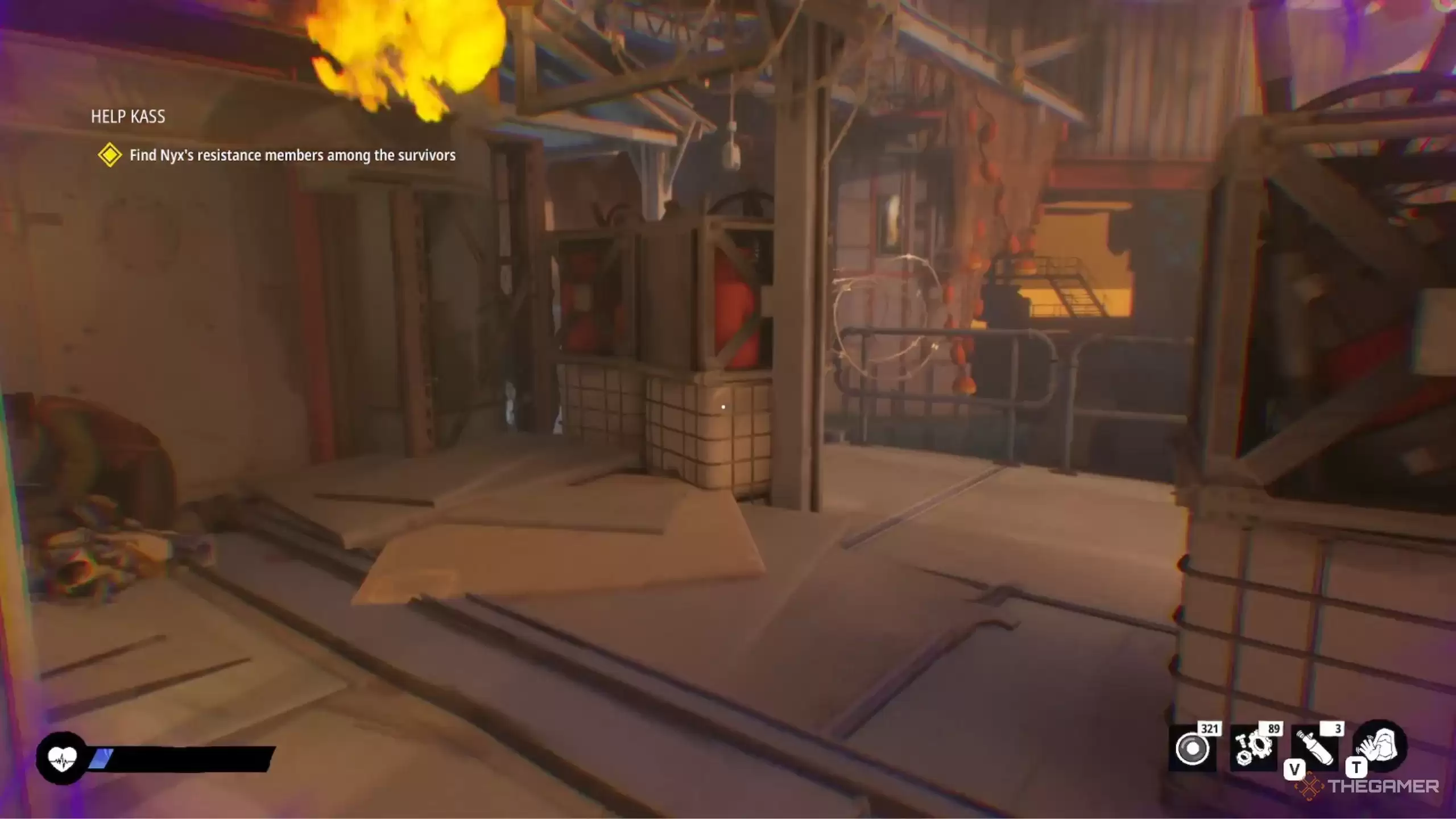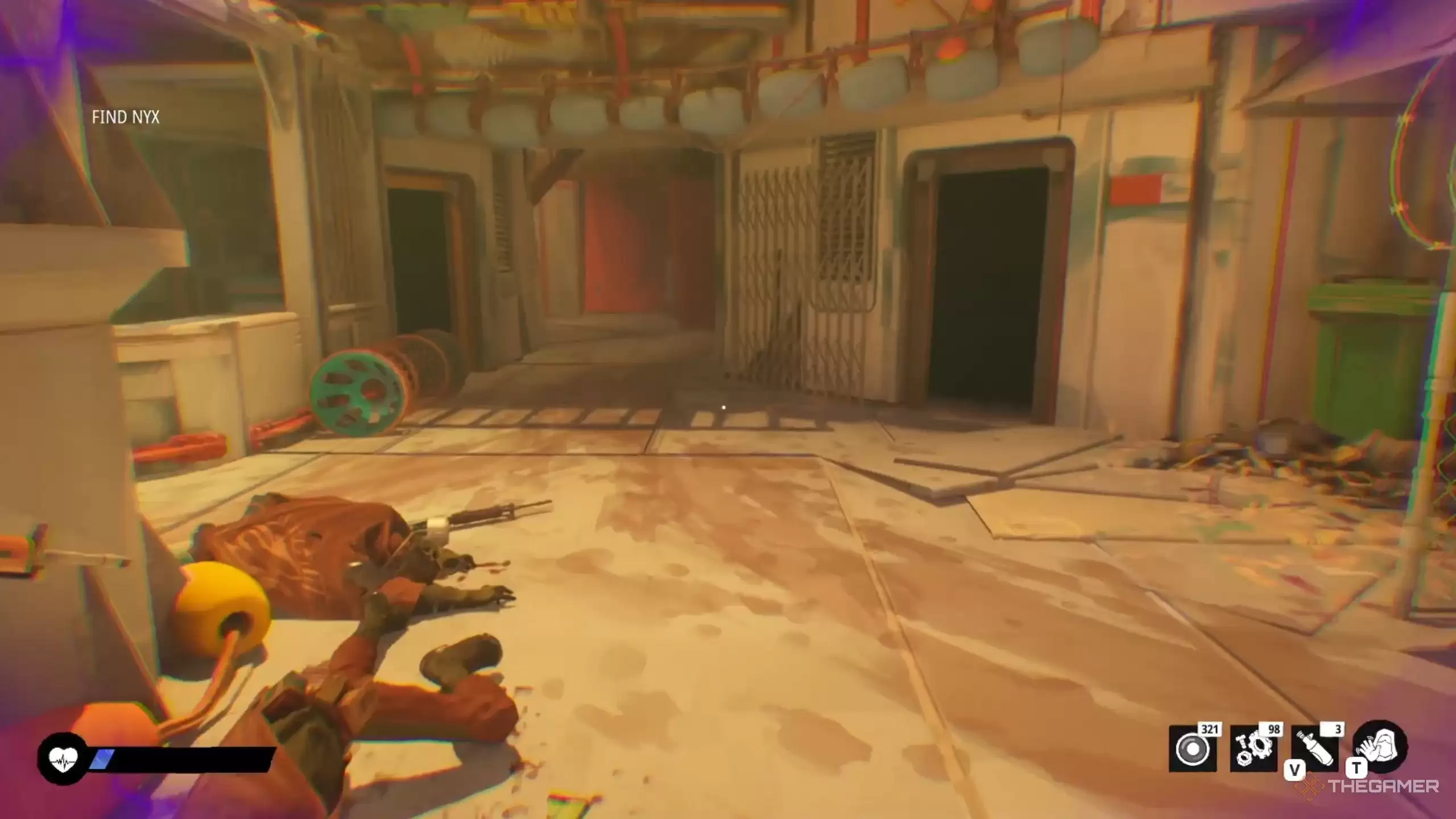 在穿过那扇红色大门之前,别忘了探索一下:蹲下进入右侧区域,一直走到头,会发现上楼的台阶。上去之后从另一侧下来。在左侧区域继续蹲伏前进,直到再次听到Nyx的谈话声。