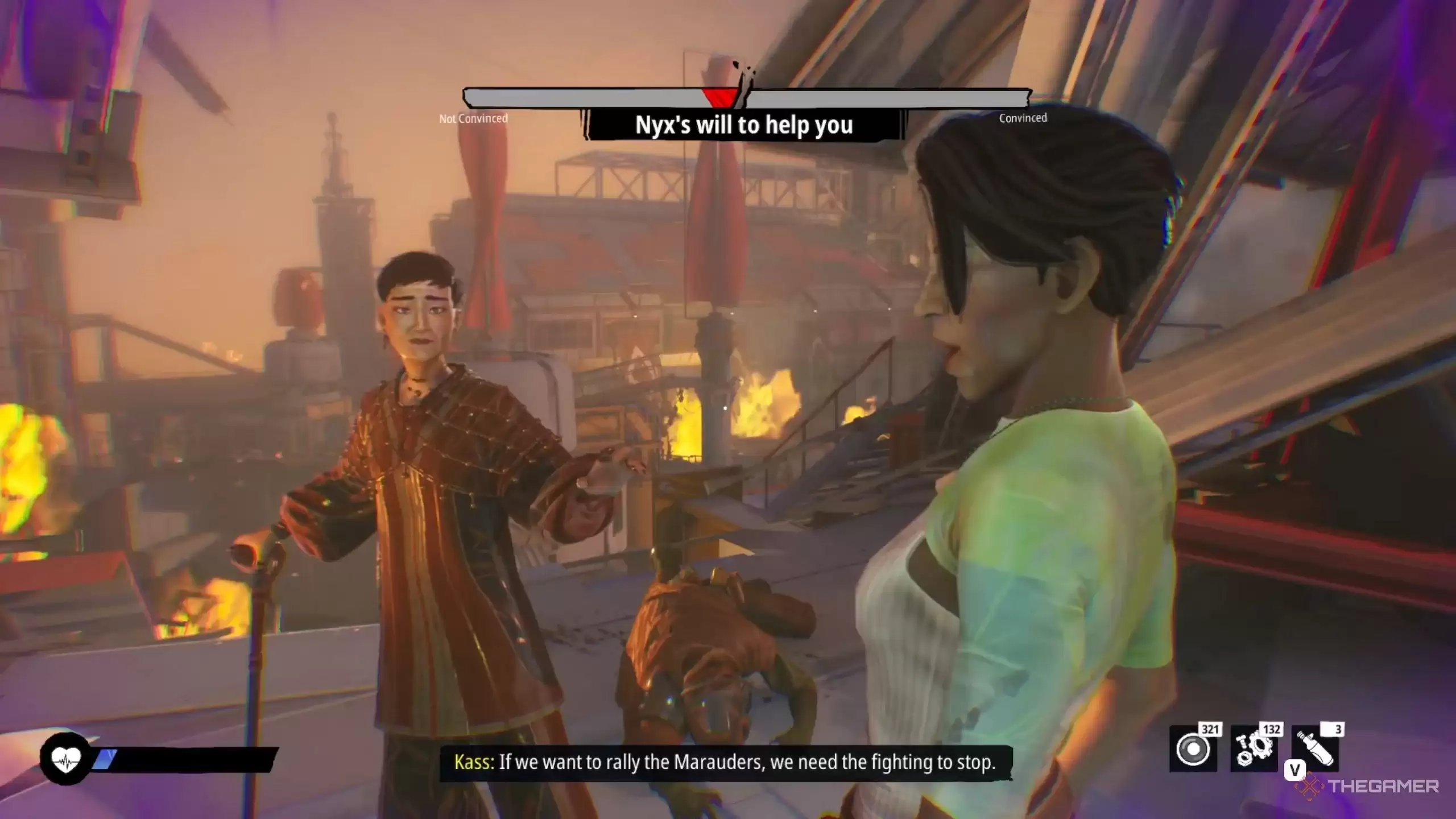卡丝前往藏身处后,便会要求你寻找Nyx本人。这时向左转,你会看到一条小巷。沿着这条路走,在丁字路口右转。继续前进,最终会遭遇Nyx卫兵的伏击。与Nyx对话时,当她向你求助,关键来了:请务必选择“仅在我的条件下”。这个选项会触发Nyx的意志进度条。