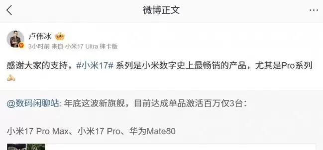 这一系列围绕背屏展开的功能创新,无疑是在持续挖掘这块副屏的实用与娱乐价值。而市场对这款产品的反响也确实热烈。小米集团合伙人、总裁,手机部总裁,小米品牌总经理卢伟冰就曾公开表示,小米 17 系列是小米数字旗舰史上最畅销的产品,其中 Pro 系列的表现尤为突出。