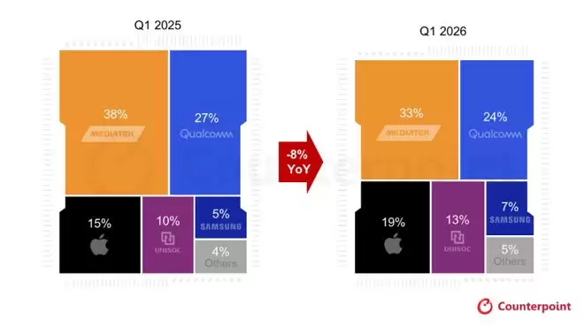 道理其实很直白:手机整体卖不动了,那么作为核心部件的显示面板、处理器SoC、摄像头传感器等元器件的需求,自然也会同步萎缩。这不,就在4月27日,知名数据分析机构Counterpoint Research发布了2026年第一季度全球智能手机SoC出货量的初步展望报告,为这场行业变局提供了清晰的注脚。