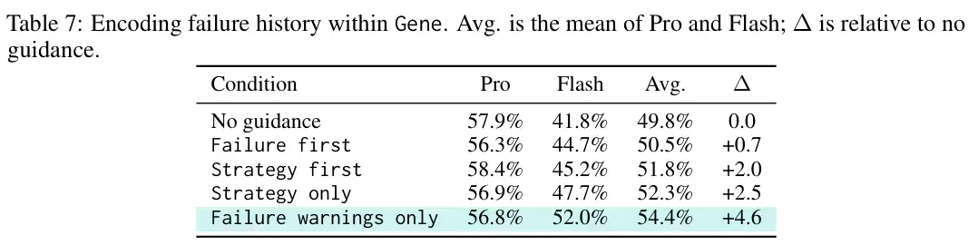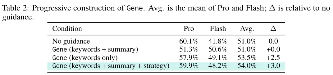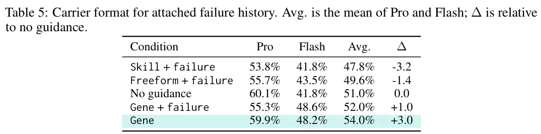 效果立竿见影。如上表所示,仅用230个Token的“基因组”,就将双模型平均通过率推升至54.0%,实现了3.0个百分点的绝对增长。它在Pro模型上保持了59.9%的高位,同时将Gemini 3.1 Flash Lite Preview的通过率从41.8%大幅拉升至48.2%。