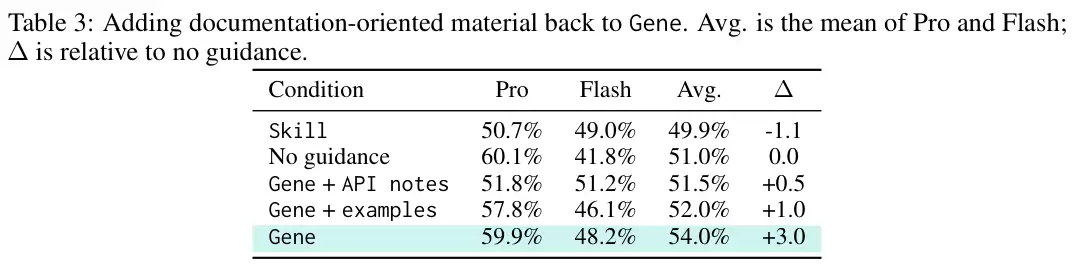 上表展示了基础设定的测试结果。在无任何经验指导的基线设定下,平均通过率为51.0%。但当引入厚重的程序化技能文档后,双模型平均通过率不升反降,跌至49.9%。在Gemini 3.1 Pro Preview模型上,情况更为严峻,通过率从60.1%重挫至50.7%。这清晰地表明,一味堆砌经验内容,不仅无法转化为有效的控制信号,反而会对高能力模型产生严重的干扰。