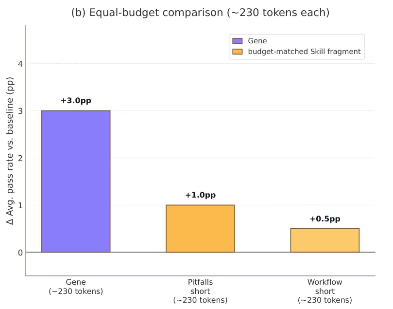 但即便如此,经过极限瘦身的缩减版技能,其表现依然全面落后于全新的“策略基因”。这揭示了一个核心缺陷:程序化技能的问题不在于缺失知识,而在于知识的呈现方式。长篇幅的文档确实包裹着有用信息,但高价值的指令信号被海量的说明性文字严重稀释了。从人类视角出发的详尽解说,在模型受限的推理预算和注意力分配机制下,彻底沦为沉重的认知负担。