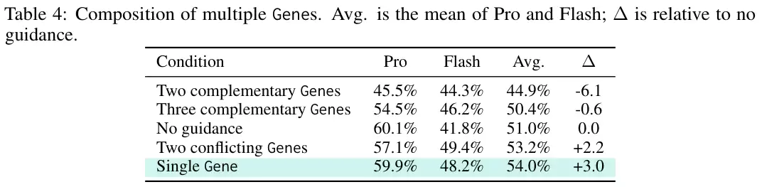 组合两个相冲突的基因,仍能保持53.2%的及格线;但凑齐两个看似互补的基因,成绩却直接垫底,降至44.9%。这在需要极高精度控制的科学场景中尤为致命:多个看似互补的控制对象会相互争夺模型的注意力,最终导致控制焦点彻底模糊。随心所欲的“技能袋”堆叠法,在严苛的科学评测面前宣告破产。