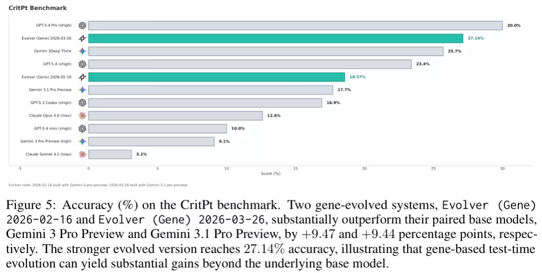 为了验证策略基因作为持续演化底座的潜力,研究团队在CritPt基准上部署了一套由OpenClaw运行环境与Evolver演化引擎驱动的基因演化系统。该系统围绕结构化的基因展开自我演化,通过记忆整合历史因果经验,并借助严格的验证机制固化成功更新。