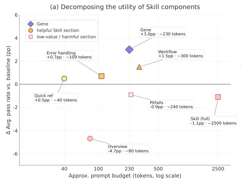 问题究竟出在哪里?研究团队进一步将臃肿的程序化技能文档拆解开来,试图找出其中真正起作用的控制信号。详尽的文档里,到底哪些内容对模型推理产生了正向引导?