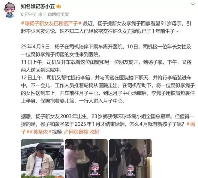 八卦媒体最近放出消息,称杨子与新女友多次被拍到出入月子中心,疑似早在一年前就已秘密生子。有网友顺着时间线一捋,发现女友的孕期似乎与杨子参加《再见爱人4》的录制时间有所重叠。