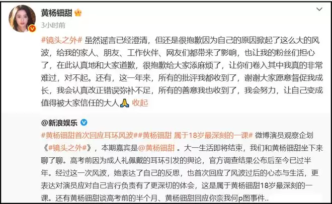 在文字道歉中,黄杨钿甜开篇就强调“天价耳环”纯属谣言,随后为自己引发的风波给家人、朋友、工作伙伴、网友和粉丝带来的影响致歉。她感谢外界的督促,并表示会认真改正错误、弥补不足。