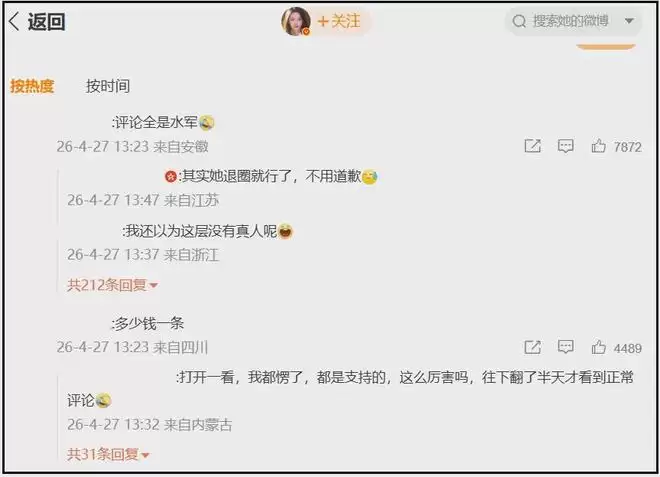 目前,黄杨钿甜的社交媒体评论区已然“沦陷”。前排的热门评论几乎清一色在质疑她“找水军洗白”。很明显,这次回应翻车了——网友并不买账这份迟到的解释,甚至有人直接留言,喊话让她“退圈”。