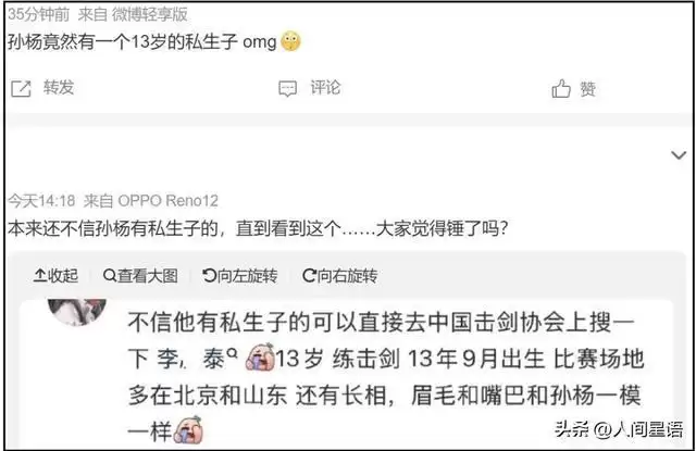 很快,有人晒出了一段颇为详细的爆料,矛头直指孙杨有“私生子”。爆料人的定位显示在浙江,提供的信息相当具体:孩子今年13岁,平时在北京学习击剑,经常往返于北京和山东参加比赛。