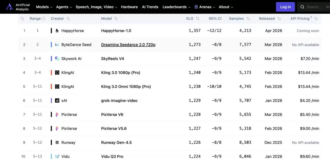 4月7日,Artificial Analysis Video Arena排行榜上悄然出现了一个匿名模型。没有公司背书,没有任何官方说明,它就这样安静登顶——然后以约60个Elo分的优势,在文生视频和图生视频两个赛道同时压过Seedance 2.0,把可灵3.0、Sora 2 Pro乃至Google Veo 3.1全部甩在身后。