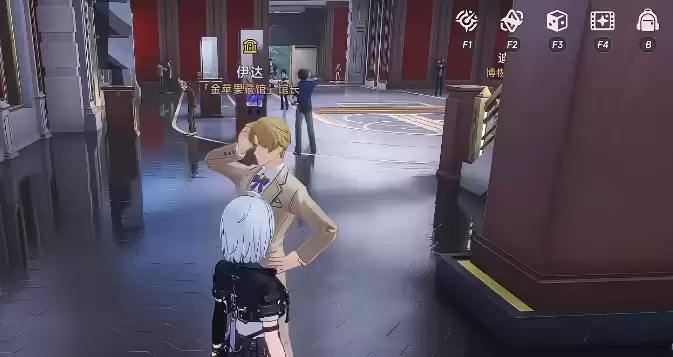 进入大厅后,贴着右侧墙壁一路向前跑到底。你会看到馆长伊达,上前和他对话。对话结束,他身后右侧的那扇大门就会为你敞开。