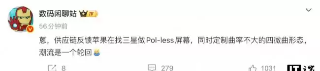 就在几天前的4月24日,@数码闲聊站 的另一条爆料提供了更多佐证。爆料称,供应链(G-Y链)反馈苹果正在向三星定制一种“曲率不大的四微曲面板”。这个消息,很自然地让人联想到传闻中为纪念iPhone问世20周年而准备的特别版机型。