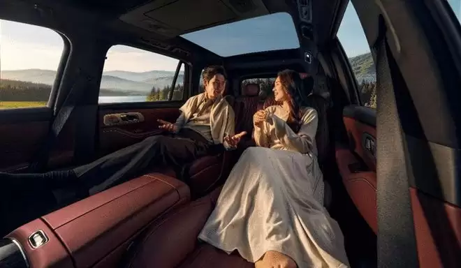 核心的升级在于感官层面。车内启用了专属的星云红高定配色,门板上采用了全新的“星河浅浪”饰纹。而顶棚则覆盖了翻毛皮手感的“柔云顶棚”,触感细腻柔和,用官方的话说,能做到“夏季不吸汗、冬季不冰脸”,这对座舱的豪华质感与乘坐舒适性确实是实打实的提升。当然,星空天幕也继续提供,营造氛围感是一把好手。