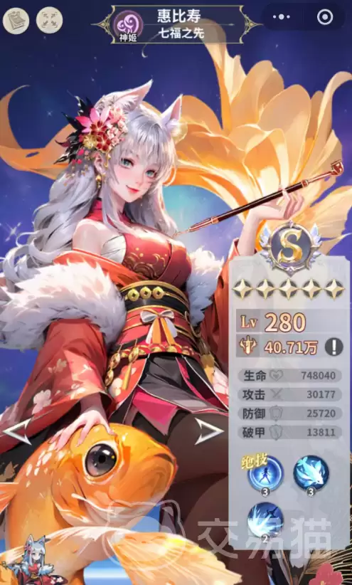作为神姬分支的代表,惠比寿主打一个“吞噬—反制—增益”的战术闭环。当目标生命值低于10%时,她可以直接将其吞噬并封锁行动;如果目标生命值高于自身,则会发动一次高达280%物理伤害的攻击。她的被动技能能让全体友方获得8%的防御提升;而每次成功吞噬后,惠比寿自身会永久增加10%的伤害减免,最高可以叠加到40%。这套机制集控制、减伤与针对性克制于一体,在应对残血收割场景,或是面对高生存阵容时,往往能起到一锤定音的关键作用。