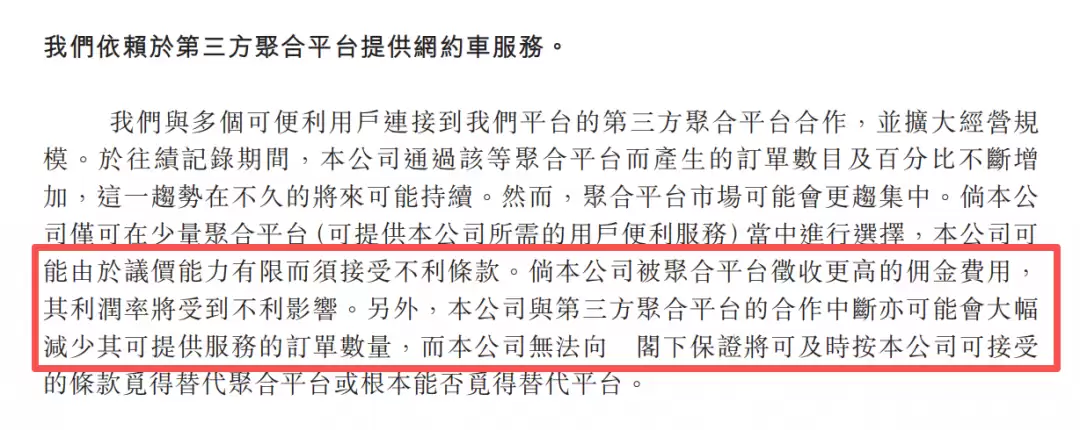 T3出行在招股书中也明确指出了这一风险:若聚合平台提高用金费率或中断合作,公司的订单量和利润率将遭受重大不利影响。