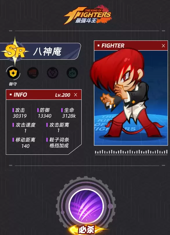 说到搭配,八神庵就是东丈的一位绝佳搭档。作为游戏中的御守角色,八神庵不仅防御能力出众,攻击力也相当优秀。他的天赋技能可以在对敌人造成大量物理伤害的同时,附加一个强大的减疗效果——命中后,目标在5秒内受到的治疗效果会降低20%。这相当于变相为我方队伍提升了20%的实战压制力。当八神庵晋升到SSR级别后,实力更是质变,能够在场上释放大范围的紫色雷火,对移动中的目标造成巨额伤害,其自身的生命值与破甲值也会获得显著成长。