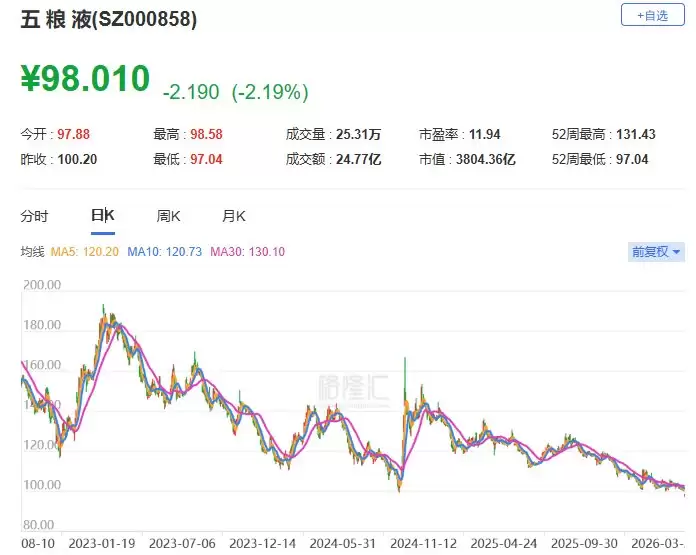 今天,五粮液(000858.SZ)的股价走势,让不少投资者心头一紧。盘中一度下跌超过3%,最低触及97.04元。这个价格,已经跌回到了2020年4月的水准,创下了超过六年来的新低。