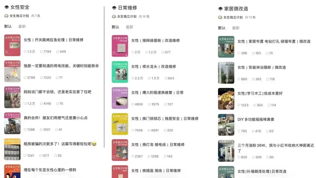 还有博主直接瞄准“技能赋能”。如@女生独立计划、@她行技能站等账号,专注为独居女性提供维修家电、更换零件、家居微改造等硬核生活干货。其中,@女生独立计划 凭借详尽的图文视频步骤教学,仅用17篇笔记就吸粉30万,目前粉丝已超111万,成为了许多独居女性的“线上生活手册”。