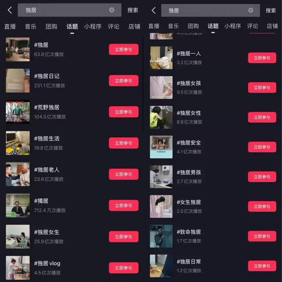 事实上,伴随着“死了么”的走红,关于其产品可持续性的质疑从未停止。但无论如何,它的爆火已经确凿地验证了一点:大规模独居群体所催生的市场需求是真实且巨大的。而在短视频领域,“独居”早已不是一个冷门标签,它正孵化出一个充满活力的内容生态。