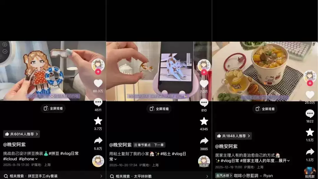 例如抖音博主@晚安阿紫,她通过分享自己的独居vlog,将租来的小屋布置得温馨惬意,伴着两只小猫,记录下制作美食、做手工、拼图的闲暇时光。她的视频往往言语不多,在轻柔的音乐中,静静展示一种充实而自洽的生活哲学。这种极具氛围感和疗愈效果的记录,让她成功吸引了超过668万粉丝的关注。