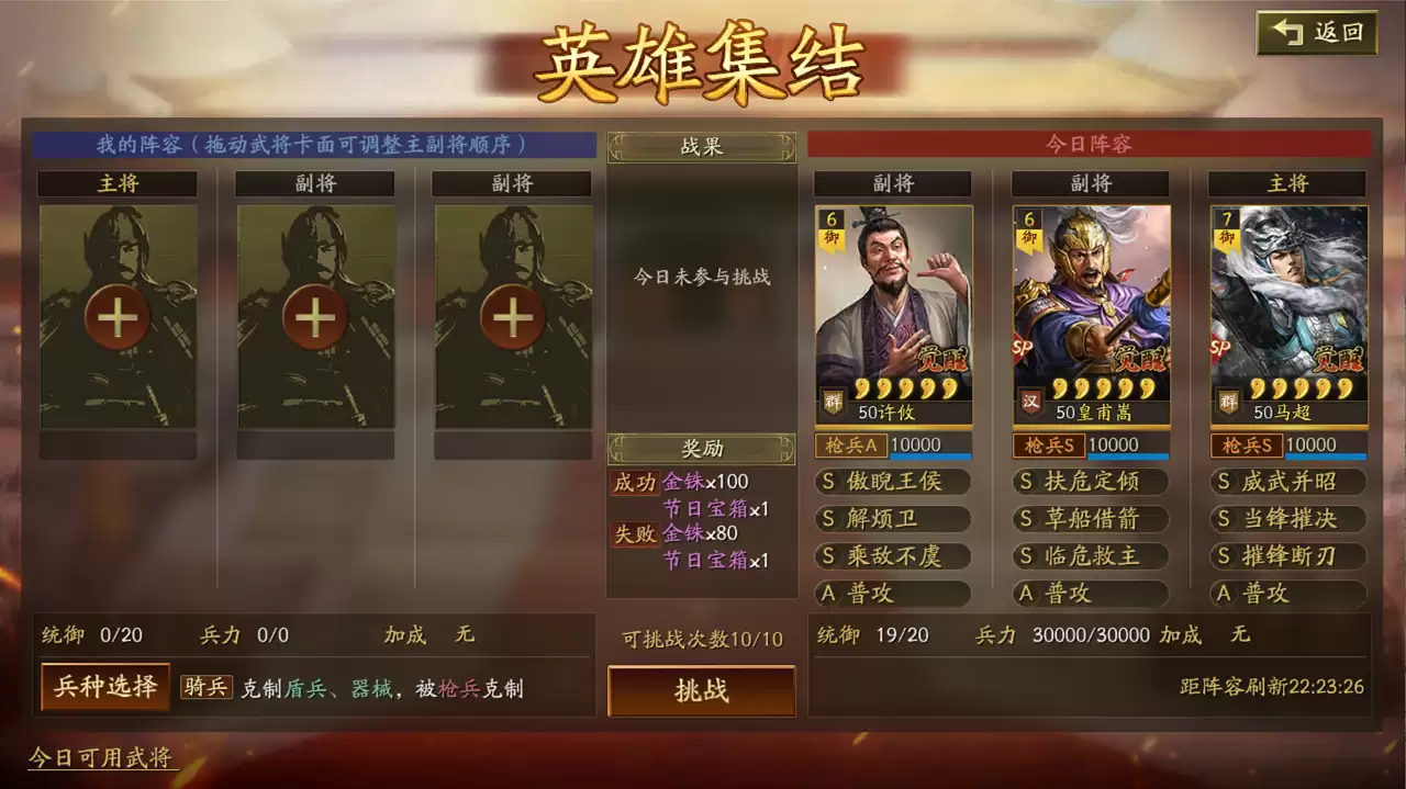 这是一个更具策略挑战性的活动。玩家需要使用指定的武将,通过合理的排兵布阵来挑战特定阵容。成功通关后,最高可领取700金铢奖励,考验的是各位对武将和阵容的理解深度。