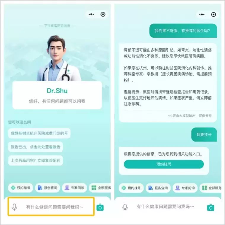 再看技术输出,这才是树兰未来增长故事的核心篇章。2025年3月上线的AI健康智能体Dr.Shu是这一曲线的重要载体。它能根据症状推荐科室、辅助生成病历、提供用药提醒与复诊随访,旨在将单次就诊延伸为终身健康管理关系。