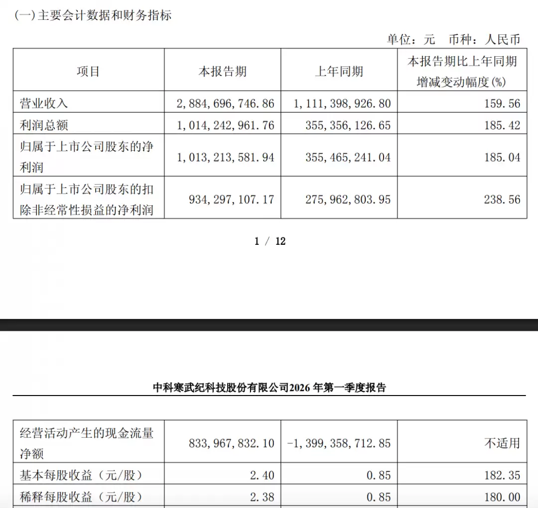 AI芯片领域的明星公司寒武纪,交出了一份堪称惊艳的季度成绩单。根据其昨晚发布的2026年第一季度财报,公司总营收达28.85亿元,同比激增159.56%;归属于上市公司股东的净利润首次突破10亿元大关,达到10.13亿元,同比增长185.04%;扣非净利润为9.34亿元,增速更是高达238.56%。